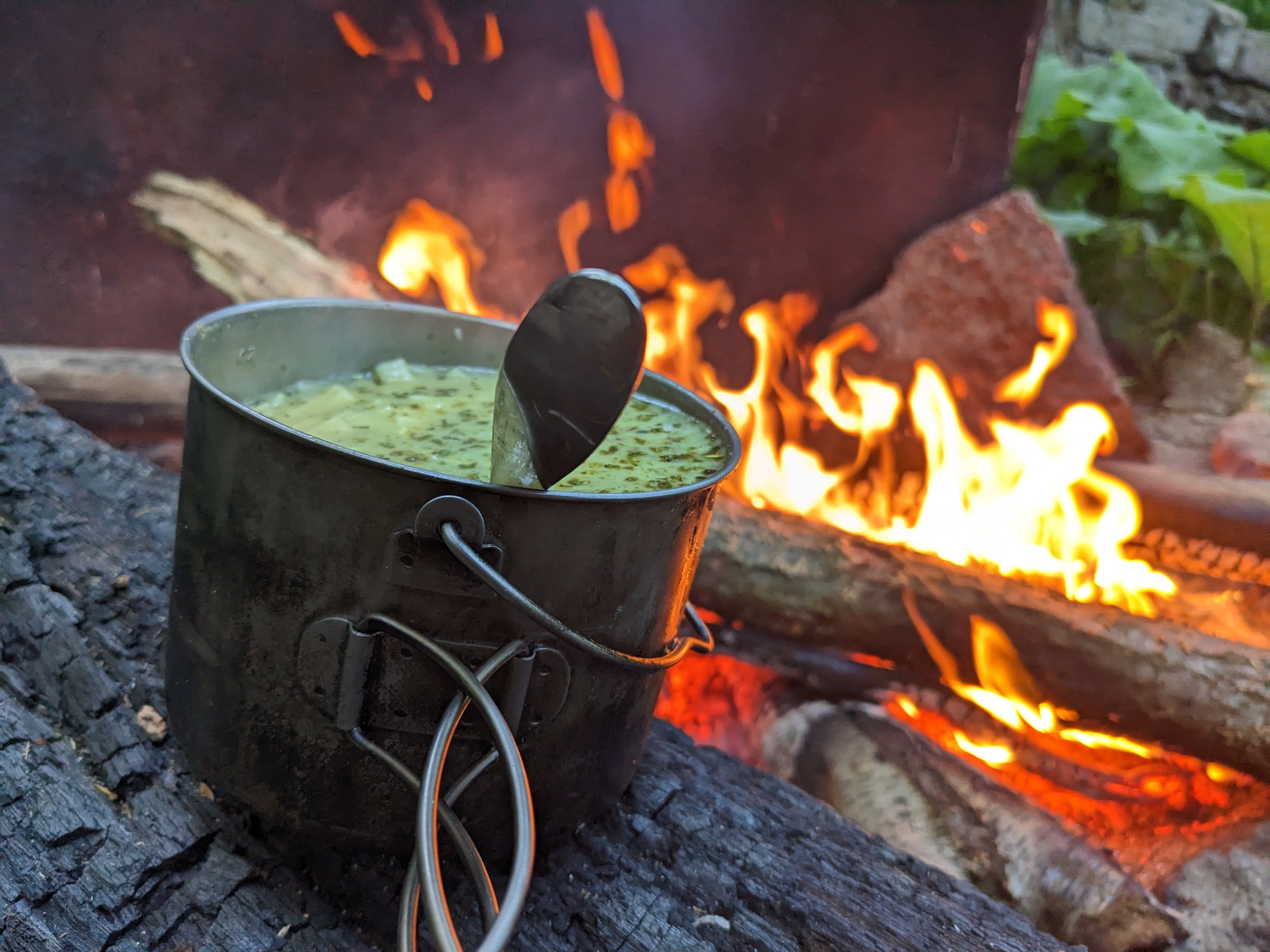 Plus, it’s ultralight, and pretty compactible. The prongs fold up along the body, and it can slide into a black drawstring bag. I could also tuck my lighter in there with it, and that fit inside my pot atop my fuel can.